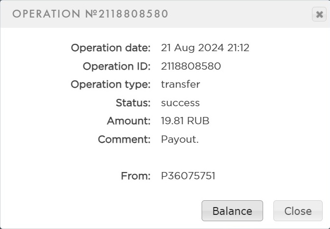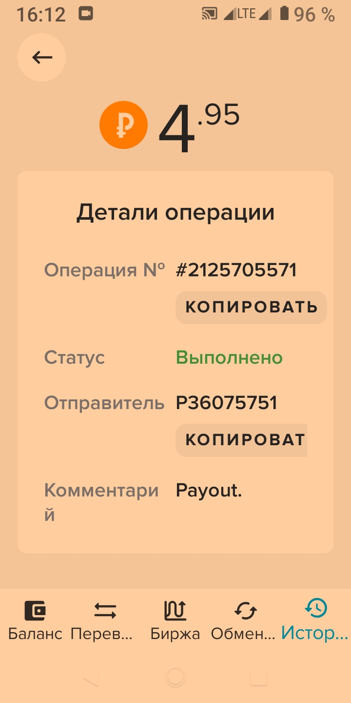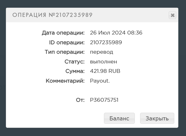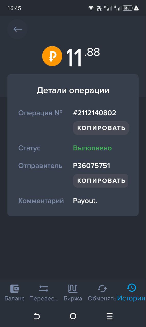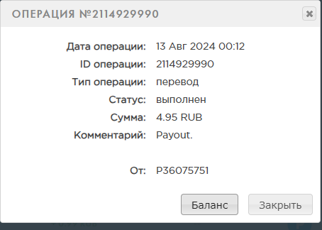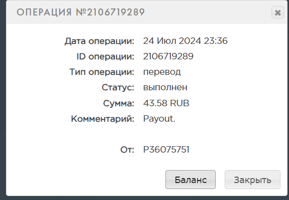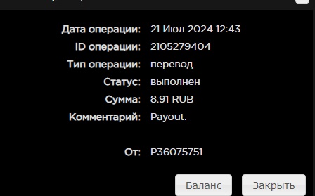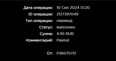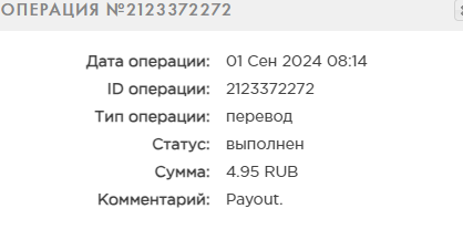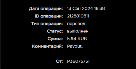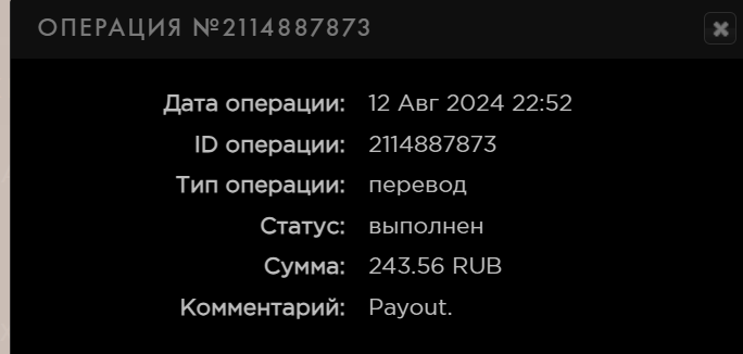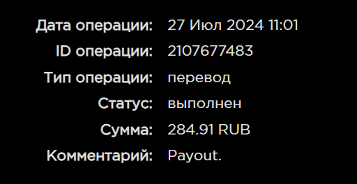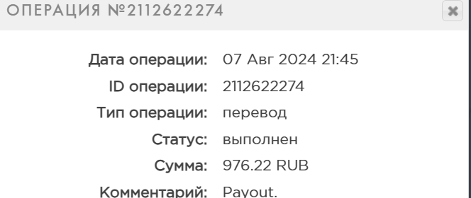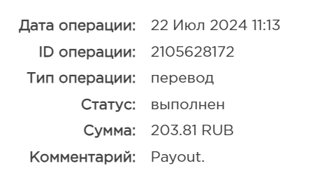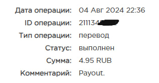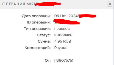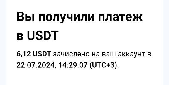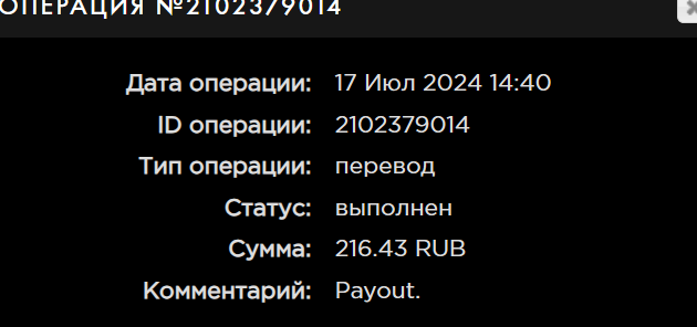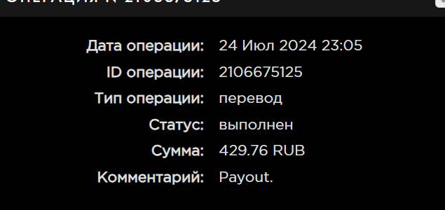 выплата пришла со скоростью пули,проект супер,спасибо большое!!! Дата операции: 12 Янв 2024 09:27