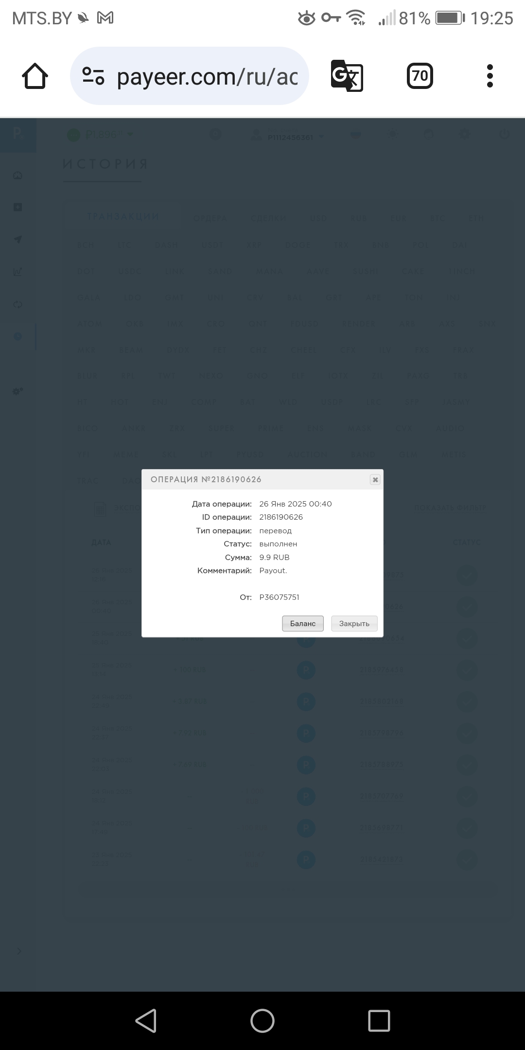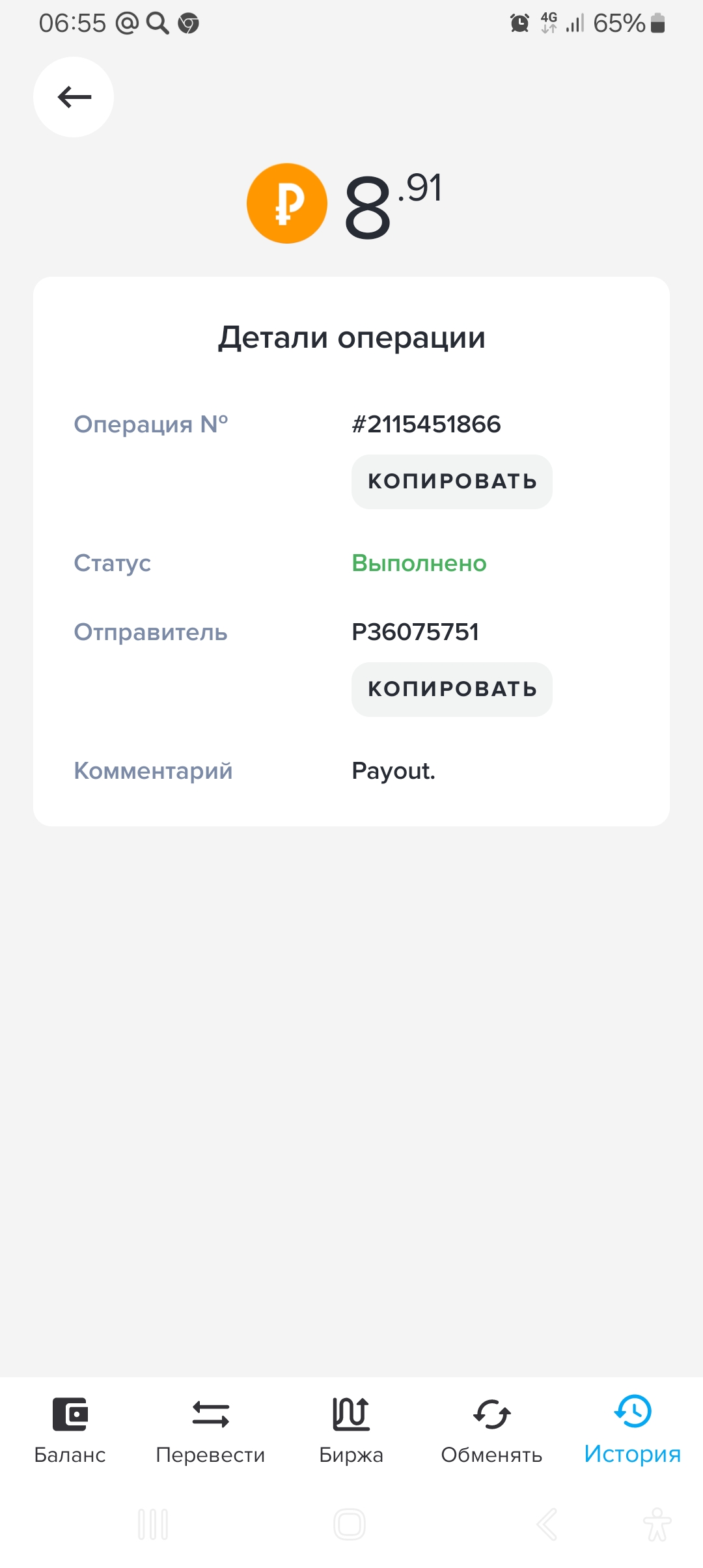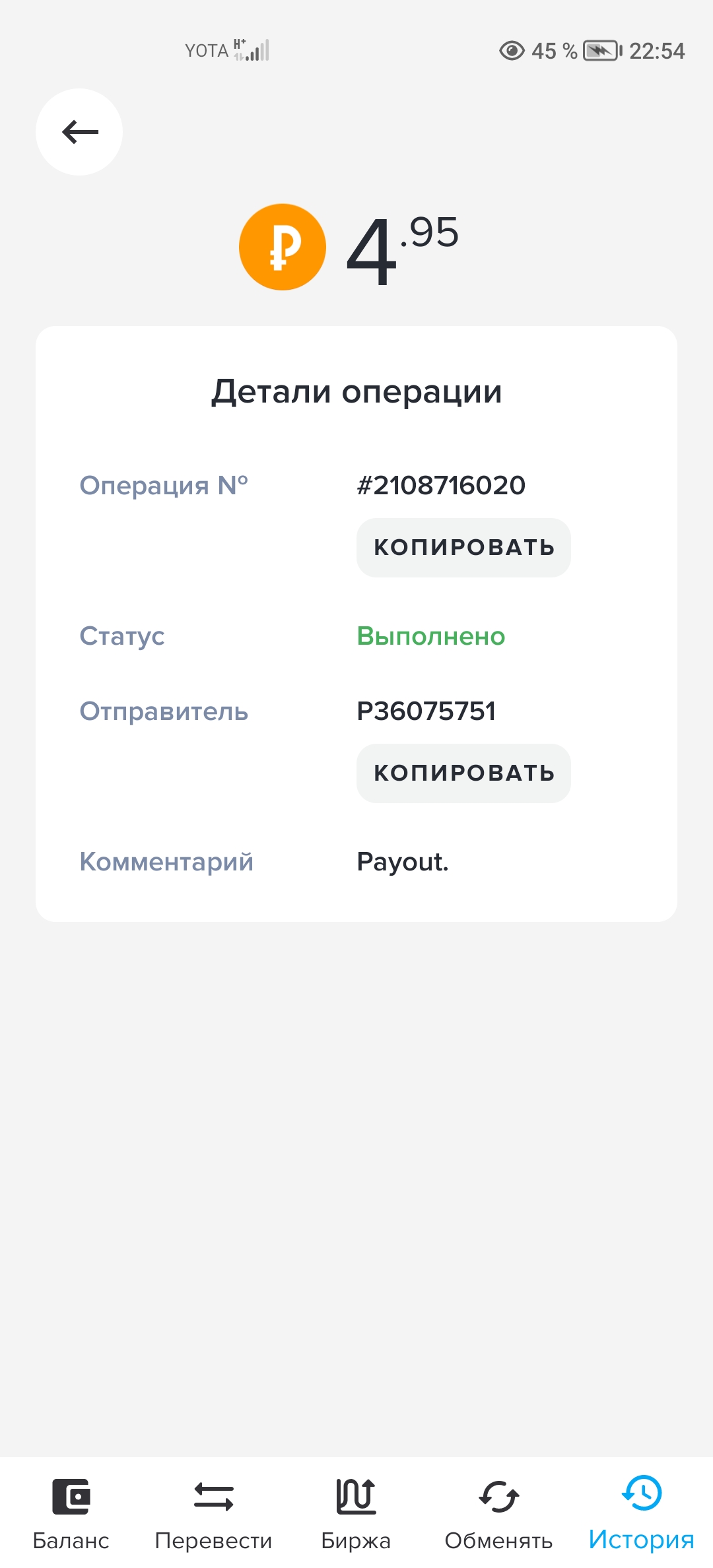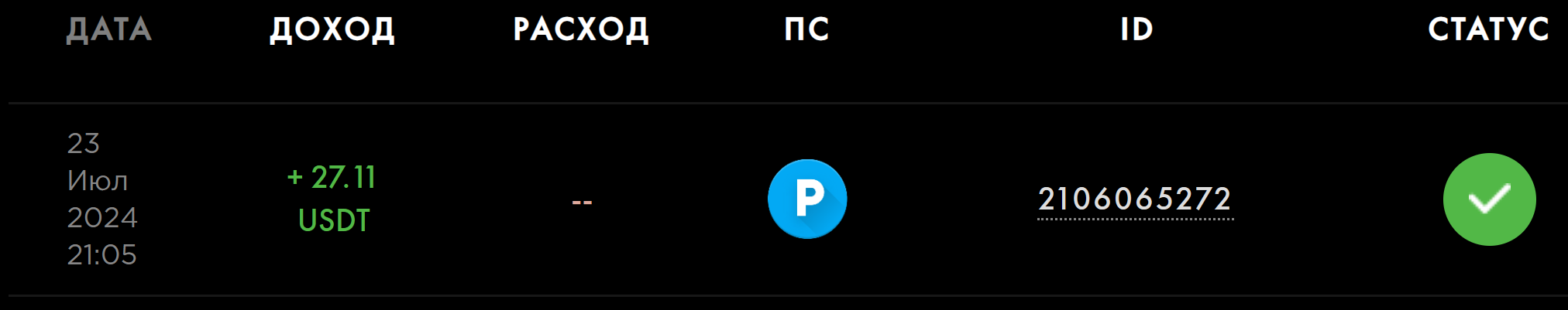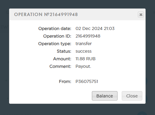 выплата пришла со скоростью пули,проект супер,спасибо большое!!! Дата операции: 12 Янв 2024 09:27