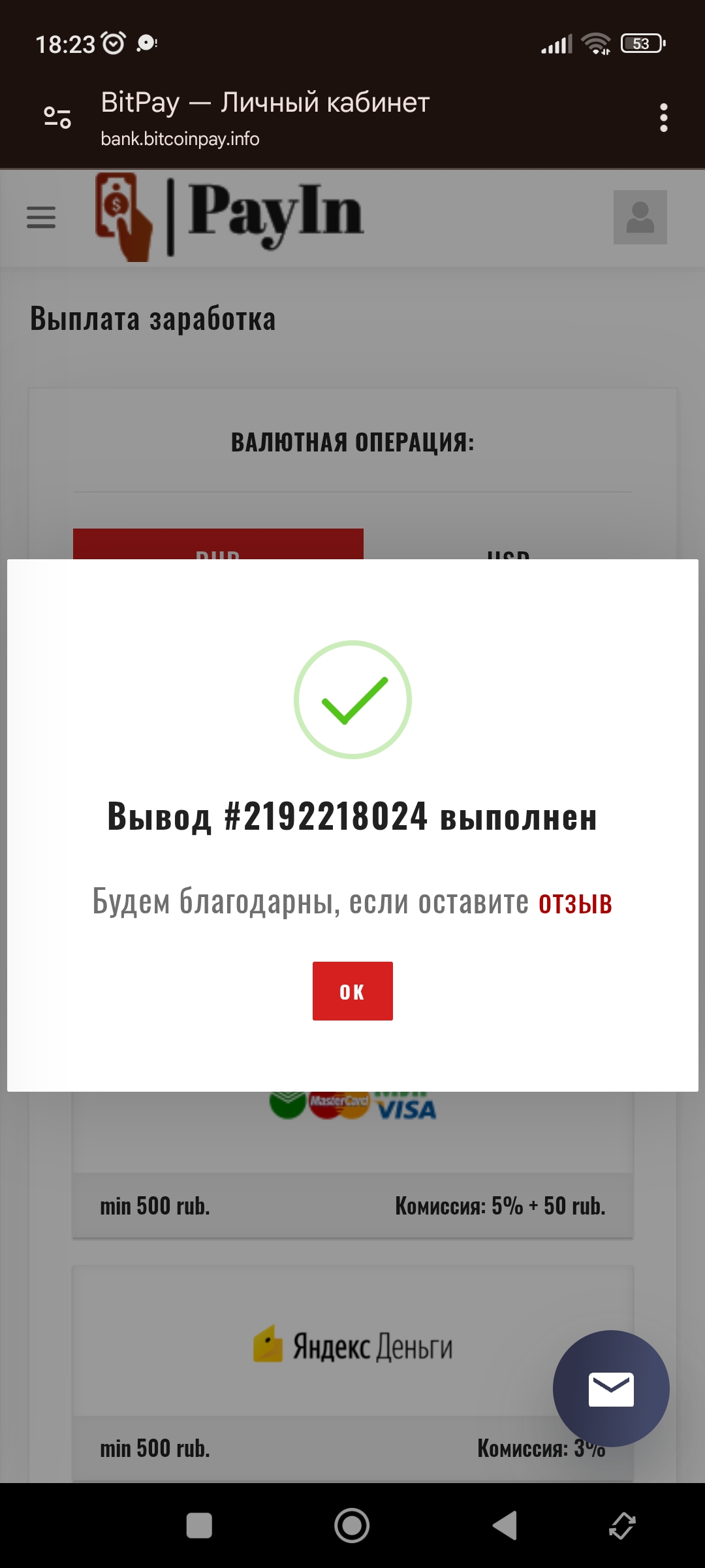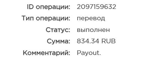 Пришла очередная выплата! Выводы приходят мгновенно и это говорит о надежности проекта! Желаю проекту очень хорошего развития а также всем стать финансовосвободными и независимыми! Пусть проект работает еще ни один год и только приносит всем радость!